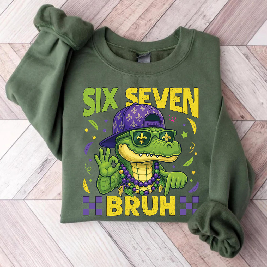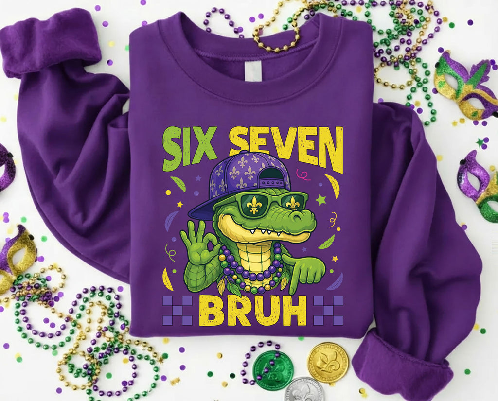 Celebrate Mardi Gras vibes with this hilarious “Six Seven Bruh” gator shirt — perfect for parades, parties, and meme lovers.