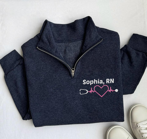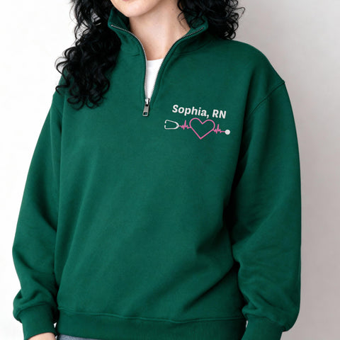 Celebrate the dedication of healthcare heroes with this Embroidered Nurse Quarter Zip Sweatshirt. Designed with a clean monogram and heartbeat-inspired nurse theme, this cozy pullover makes a meaningful everyday layer for work, travel, or relaxing off-duty. A thoughtful choice for nurse graduation, appreciation gifts, or personal wear.