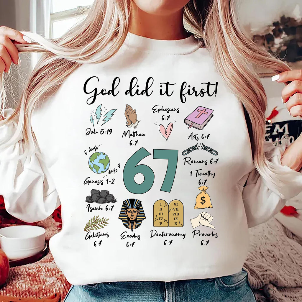 Share your faith boldly with this “God Did It First 67” Christian shirt — perfect for believers who love scripture, worship, and inspirational messages.