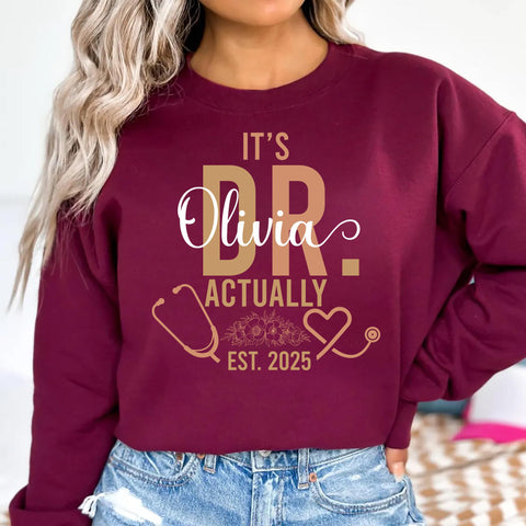 It’s Dr. Actually Sweatshirt, Custom Doctor Sweatshirt, PhD Graduation Sweatshirt, Doctor Est. Sweatshirt, New MD PhD Gift for Medical Graduates