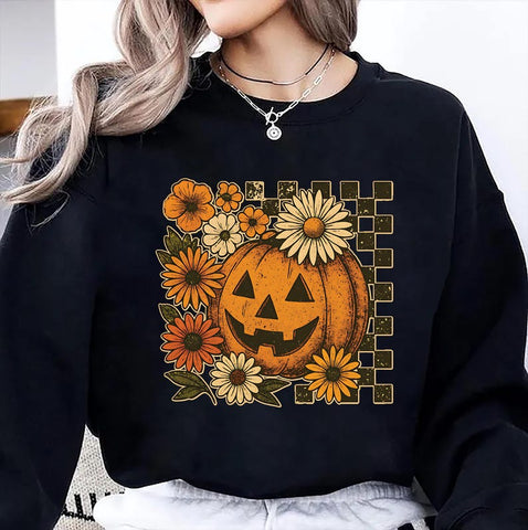 Retro Floral Pumpkin Shirt, Preppy Checkered Halloween Sweatshirt, Funny Fall Hoodie, Spooky Season Long Sleeve Shirt, Cute Pumpkin Outfit