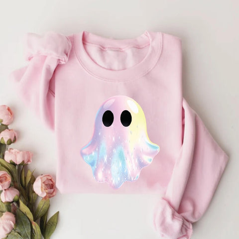 Shimmering Ghost Sweatshirt, Iridescent-Look Ghost Crewneck Sweatshirt, Cute Glitter Ghost Design, Halloween, Unisex Spooky Season Shirt, Gifts for Her