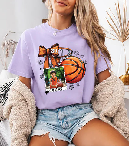 Coquette Bow Basketball Custom Name and Photo Shirt, Basketball Mom Shirt, Personalized Sports Dad Tee