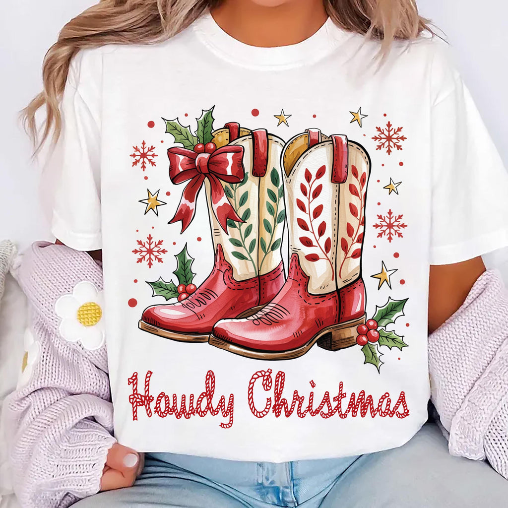 Celebrate the season with western charm in our Howdy Christmas Shirt! Featuring a festive cowgirl boots and coquette-inspired design, this holiday tee is perfect for women, western lovers, and anyone wanting a country Christmas vibe.