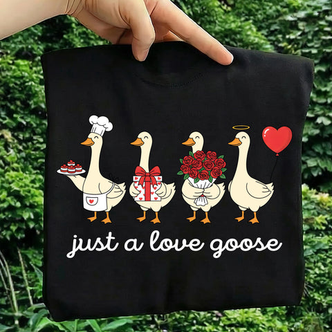 Celebrate love with this adorable “Just a Love Goose” design — perfect for Valentine’s Day, anniversaries, or anyone who loves cute goose humor.