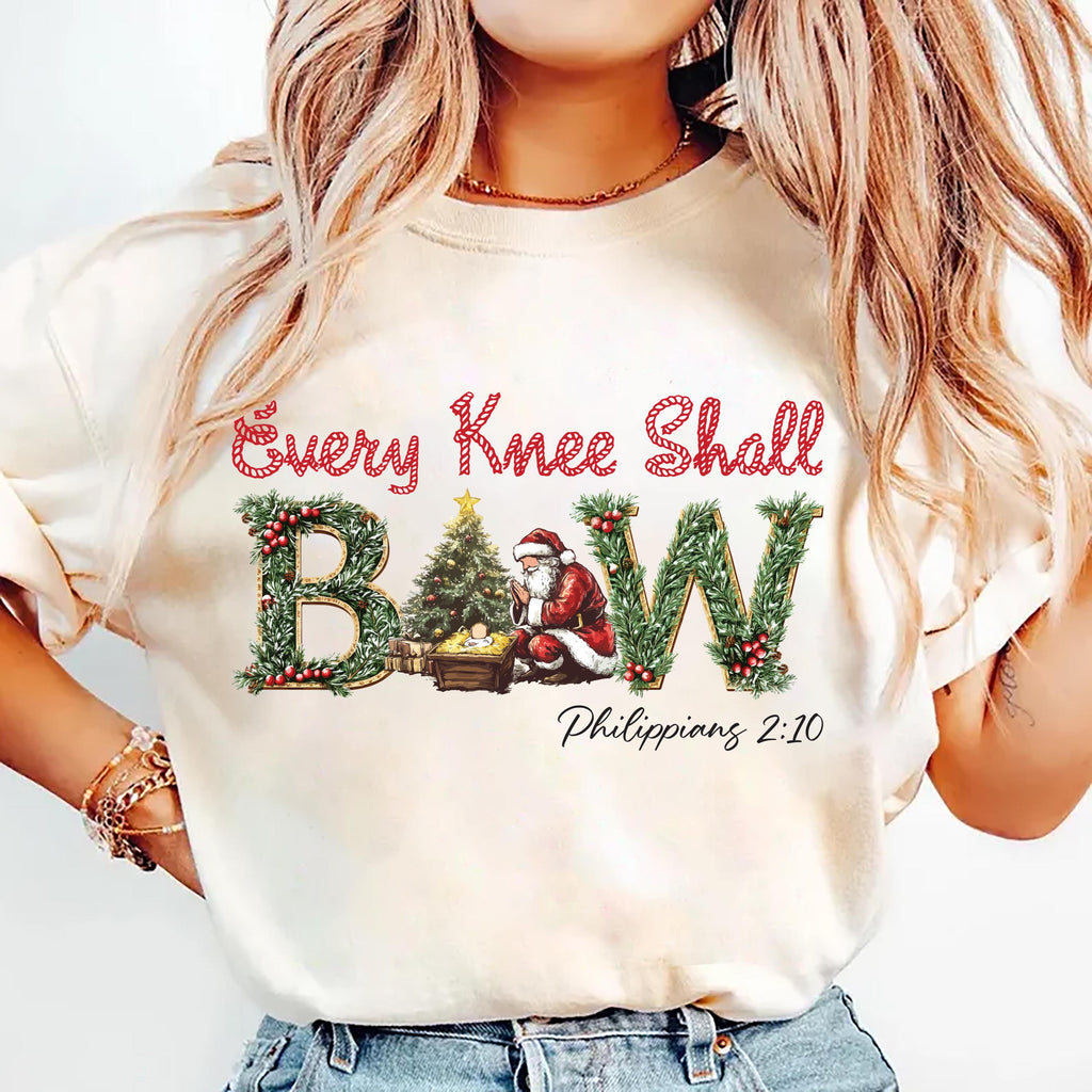 Honor the reason for the season with our Nativity Scene Shirt! Featuring a stunning watercolor Baby Jesus design and the phrase βEvery Knee Shall Bow,β this shirt is perfect for celebrating your faith this Christmas.