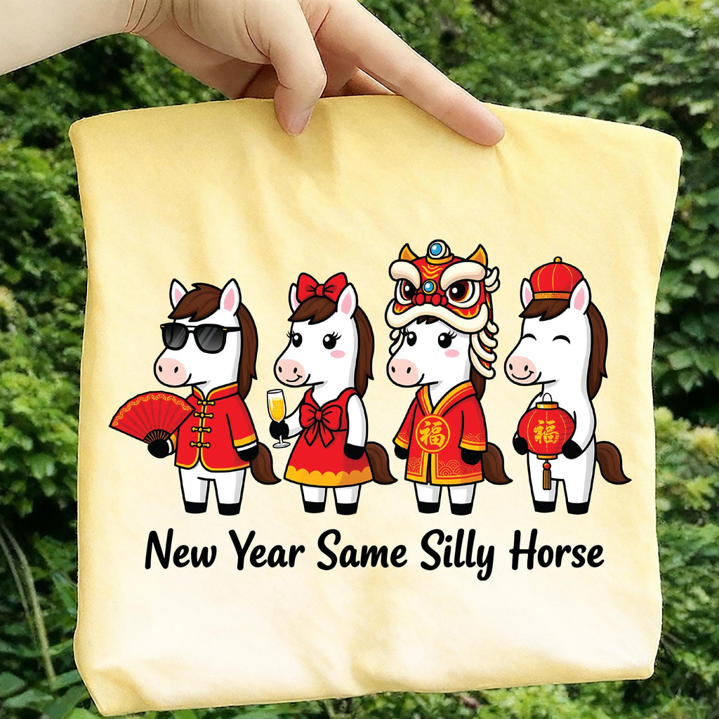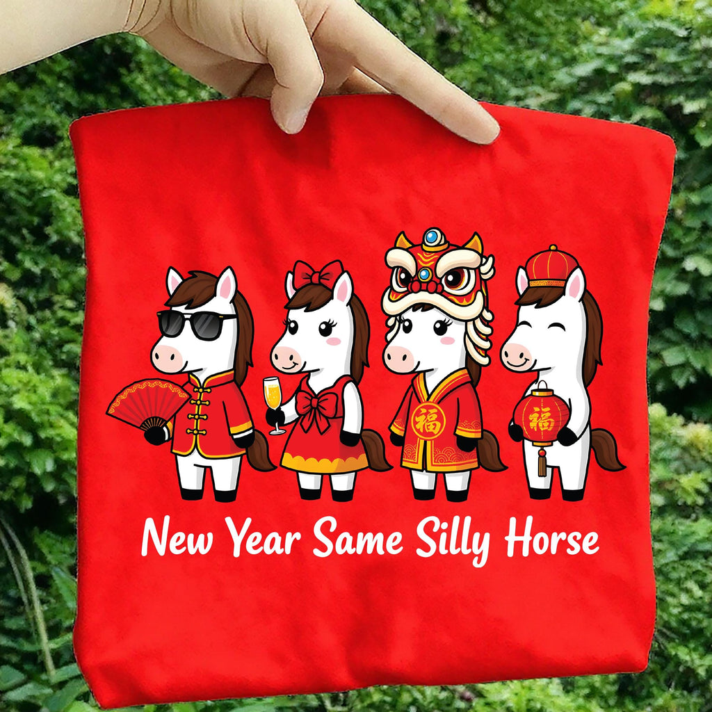 Celebrate Lunar New Year with this adorable β€œNew Year Same Silly Horse” design β€” perfect for festive celebrations, parties, and family gatherings.