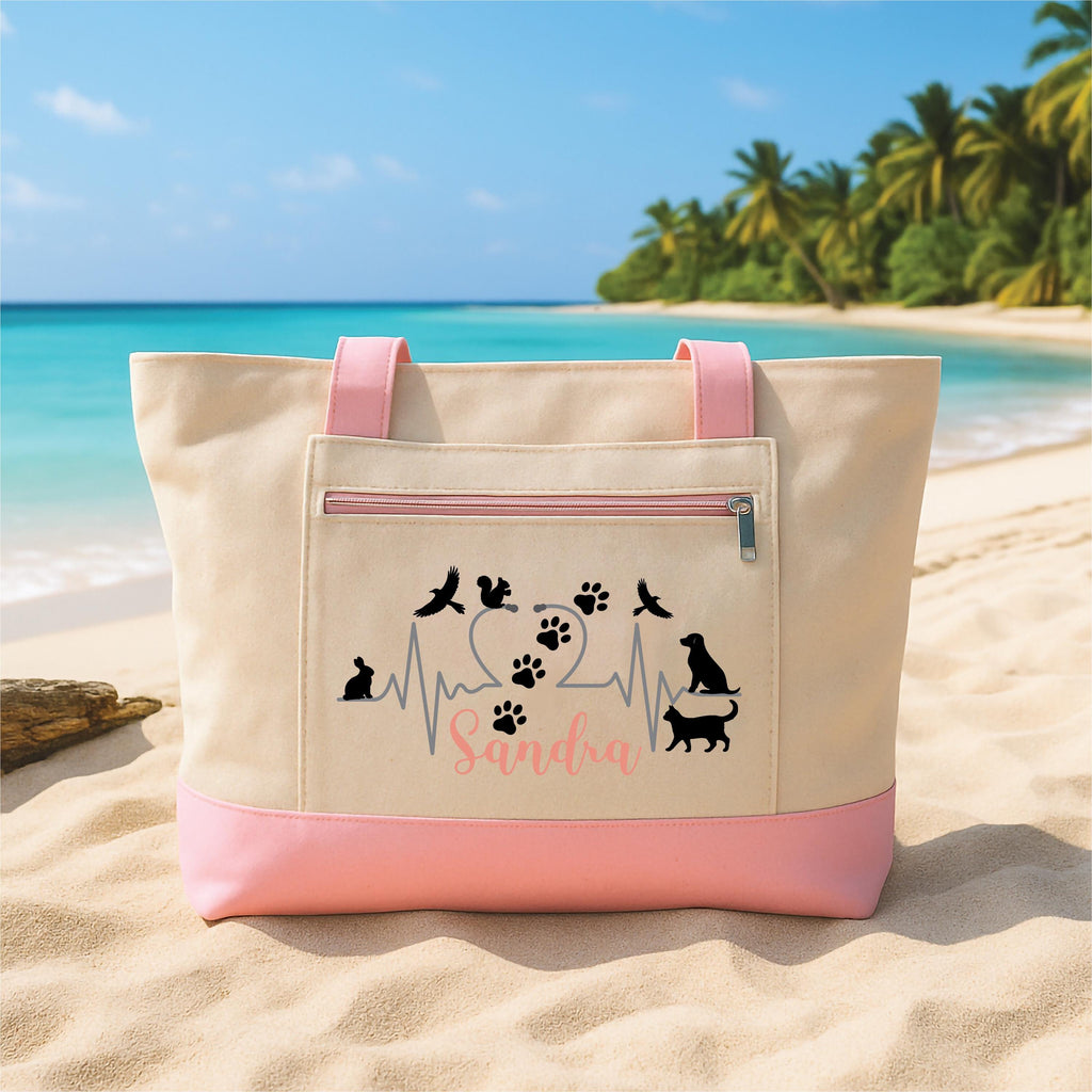 Carry your love for your pets everywhere with this Custom Pet Lover Tote Bag with Zipper. Personalized with a name and a unique animal heartbeat design, this canvas tote is perfect for dog moms, cat lovers, veterinarians, and animal enthusiasts.