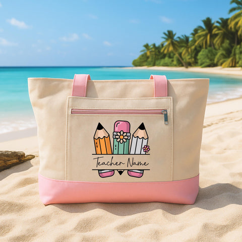 Bright, cheerful, and personalized just for your favorite teacher — this Custom Teacher Name Tote Bag features adorable pastel pencils with floral accents and a customizable script name. Perfect for carrying books, supplies, folders, lunch, and everything needed for a busy school day!