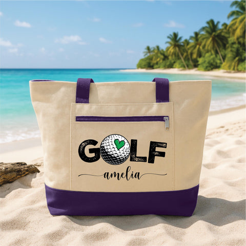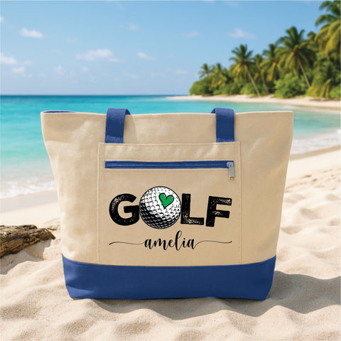 Show your love for the game with this Custom Tote Bag with Zipper, featuring a stylish golf design personalized with a name. Perfect for golf lovers, players, and fans, this durable canvas tote is ideal for carrying essentials to the course, travel, or everyday use.