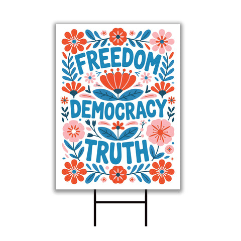 Freedom Democracy Truth Protest Yard Sign - Resist Hate Lawn Sign, Anti-Trump Sign, Resist Racism, Resist Fascism Yard Sign with Metal H-Stake. Economical and durable, our Coroplast Yard Signs are a staple of outdoor advertising. These outdoor Resist Yard Sign full color direct printed graphics are vertically fluted for use with an H-Stake. Coroplast is typically used for yard, parking, real estate, and election signs. They are waterproof. Crafted with care, each piece is made to order, ensuring a unique, personalized touch just for you