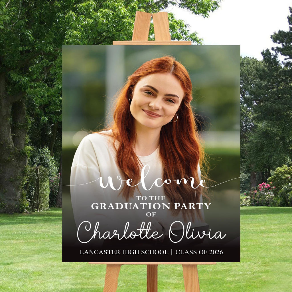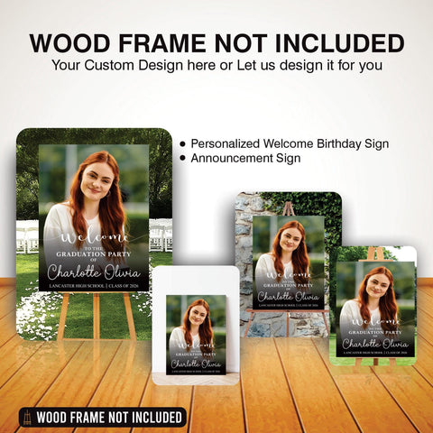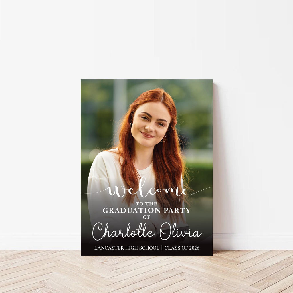 Welcome guests with a stunning Custom Senior Photo Graduation Party Sign! Perfect for High School or College Class of 2026 celebrations, this personalized welcome board adds a memorable touch to your event. Available in Foamcore, PVC, Acrylic, and Polystyrene for the perfect display option.