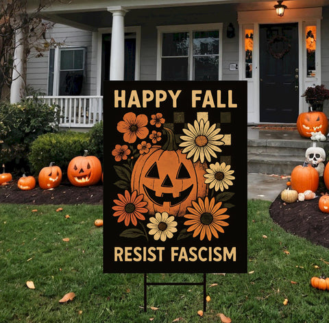 Anti-Trump Resist Fascism Halloween Fall Yard Sign - Resist Hate Lawn Sign, Anti-Trump Sign, Resist Racism Yard Sign with Metal H-Stake. Economical and durable, our Coroplast Yard Signs are a staple of outdoor advertising. These outdoor Resist Yard Sign full color direct printed graphics are vertically fluted for use with an H-Stake. Coroplast is typically used for yard, parking, real estate, and election signs. They are waterproof. Crafted with care, each piece is made to order, ensuring a unique, personalized touch just for you