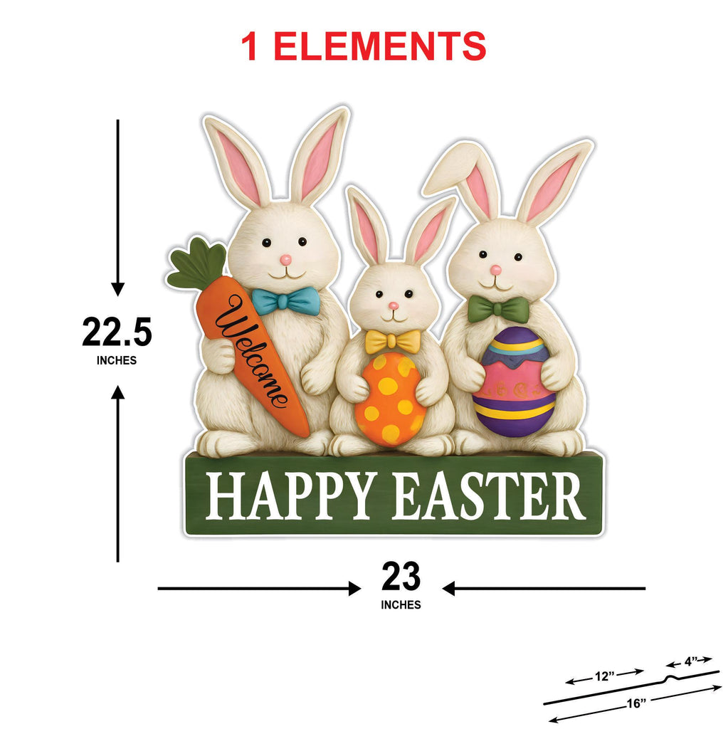 Celebrate Easter with this charming bunny yard sign cutout featuring three adorable rabbits holding colorful Easter eggs and a carrot with a cheerful “Happy Easter” message. This festive design adds warmth and joy to your outdoor Easter décor.
