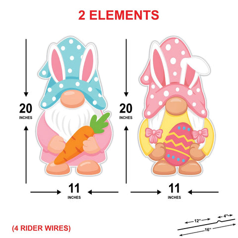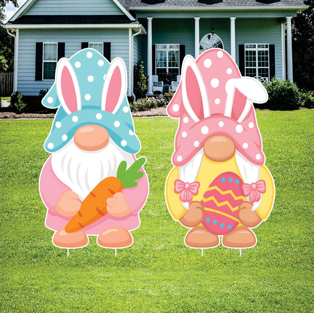 Celebrate Easter with this adorable pair of bunny gnome yard sign cutouts. Featuring pastel gnomes dressed in bunny hats, one holding a carrot and the other an Easter egg, this cheerful set adds sweet seasonal charm to lawns, gardens, and outdoor Easter displays.