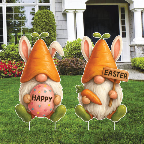 Celebrate Easter with these charming carrot gnome yard sign cutouts, featuring adorable gnomes with bunny ears, carrots, and festive Easter details. This playful spring design adds warmth and personality to any outdoor space.