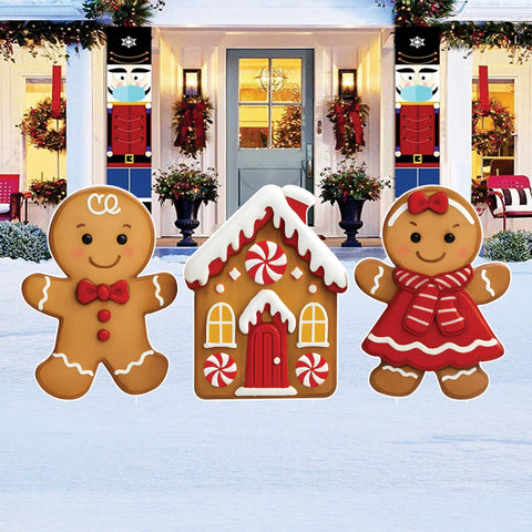 Sweeten up your holiday décor with our Gingerbread Couple with House Yard Sign Set! Featuring a smiling gingerbread boy, girl, and a candy-decorated gingerbread house, this charming trio brings a festive touch to any outdoor space. Made of 4mm corrugated plastic and UV-printed for vivid, fade-resistant colors, these waterproof signs are perfect for displaying on lawns, gardens, patios, and walkways. Rust-free metal stakes included for easy setup and long-lasting Christmas cheer.