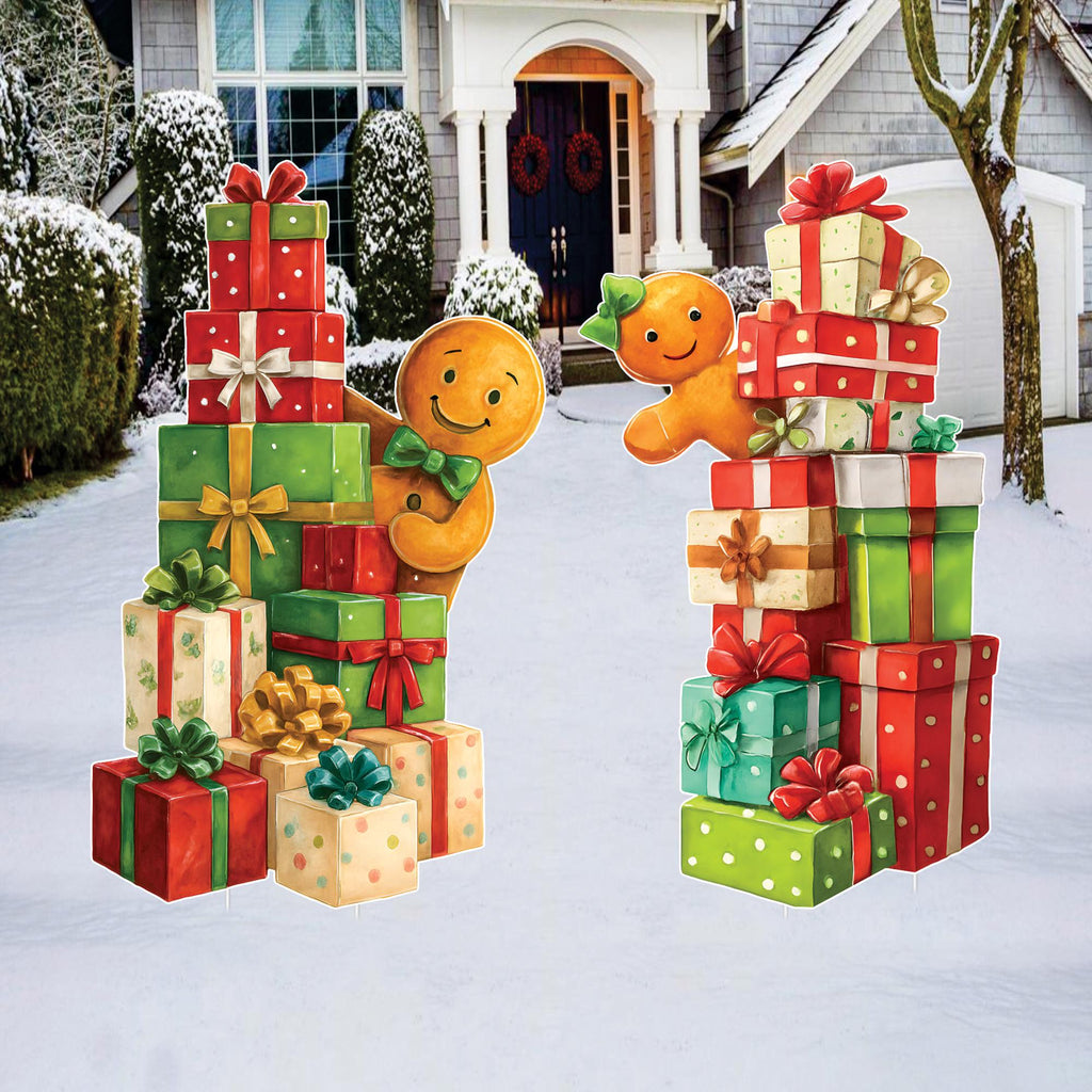 Celebrate the joy of giving with this Gingerbread Couple with Gift Boxes Yard Sign — a fun and colorful addition to your Christmas outdoor décor!