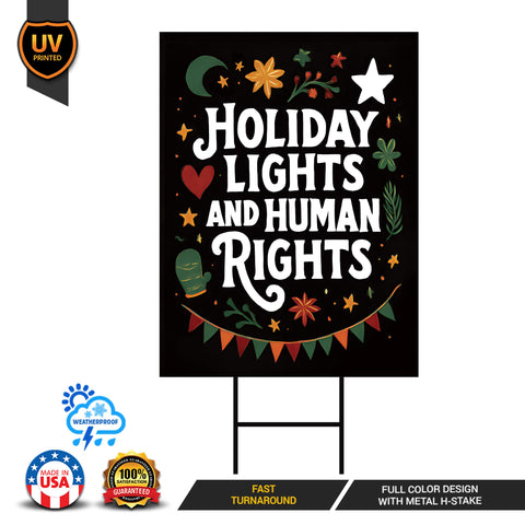 Holiday Lights and Human Rights Liberal Christmas Yard Sign - Anti-Trump, No Kings, Pro Democracy, Anti Fascist Yard Sign with Metal H-Stake