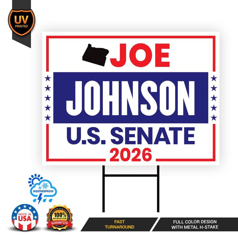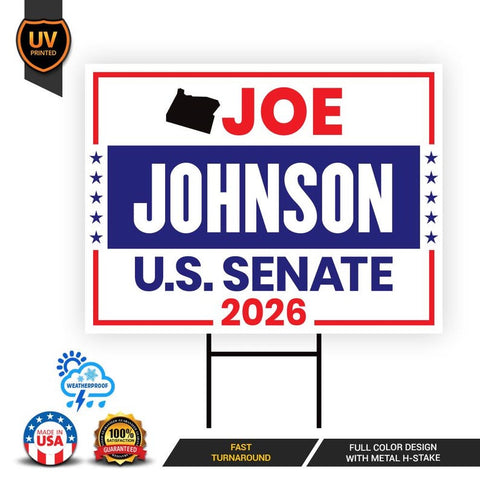 Joe Johnson For Oregon Senate 2026 Yard Sign, Corrugated Plastic Senate Elections, Republican Party, Race Red White & Blue Yard Sign with Metal H-Stake. Economical and durable, our Coroplast Yard Signs are a staple of outdoor advertising. These outdoor Joe Johnson For Oregon Senate 2026 Yard Sign full color direct printed graphics are vertically fluted for use with an H-Stake. Coroplast is typically used for yard, parking, real estate, and election signs. They are waterproof. Crafted with care, each piece is made to order, ensuring a unique, personalized touch just for you