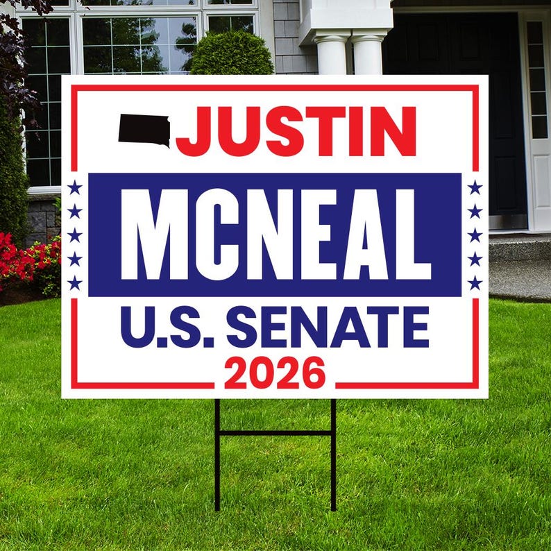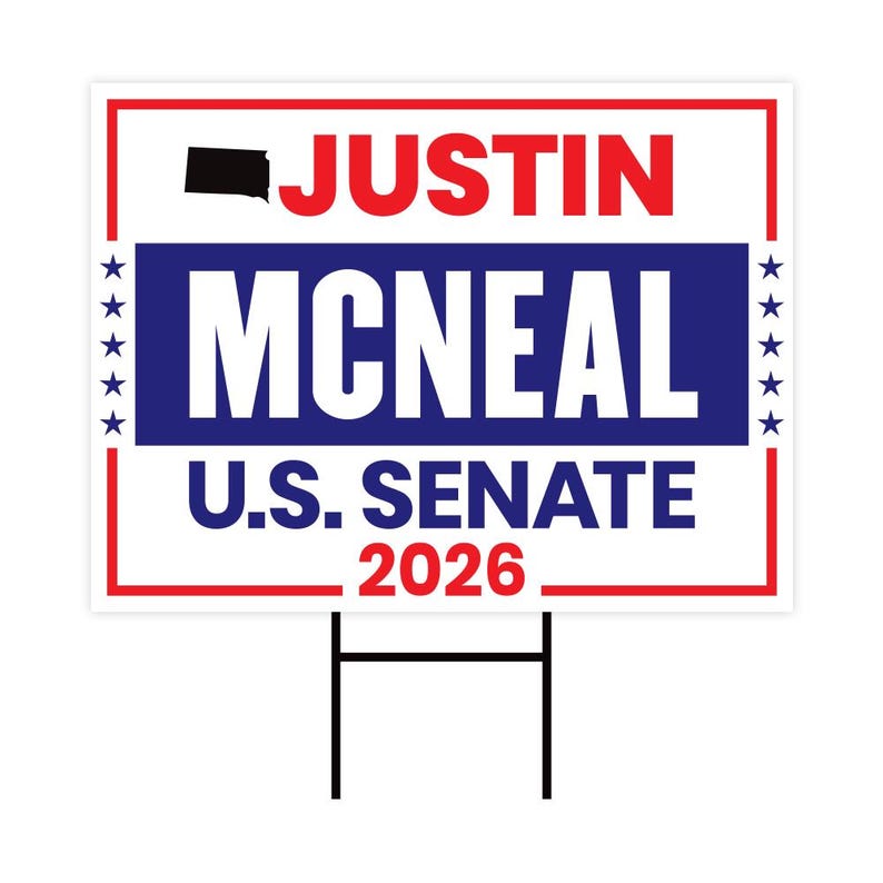 Justin McNeal For South Dakota Senate 2026 Yard Sign, Corrugated Plastic Senate Elections, Republican Party, Race Red White & Blue Yard Sign with Metal H-Stake. Economical and durable, our Coroplast Yard Signs are a staple of outdoor advertising. These outdoor Justin McNeal For South Dakota Senate 2026 Yard Sign full color direct printed graphics are vertically fluted for use with an H-Stake. Coroplast is typically used for yard, parking, real estate, and election signs. They are waterproof. Crafted with care, each piece is made to order, ensuring a unique, personalized touch just for you
