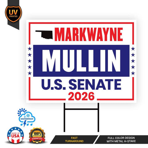 Markwayne Mullin For Oklahoma Senate 2026 Yard Sign, Corrugated Plastic Senate Elections, Republican Party, Race Red White & Blue Yard Sign with Metal H-Stake. Economical and durable, our Coroplast Yard Signs are a staple of outdoor advertising. These outdoor Markwayne Mullin For Oklahoma Senate 2026 Yard Sign full color direct printed graphics are vertically fluted for use with an H-Stake. Coroplast is typically used for yard, parking, real estate, and election signs. They are waterproof. Crafted with care, each piece is made to order, ensuring a unique, personalized touch just for you
