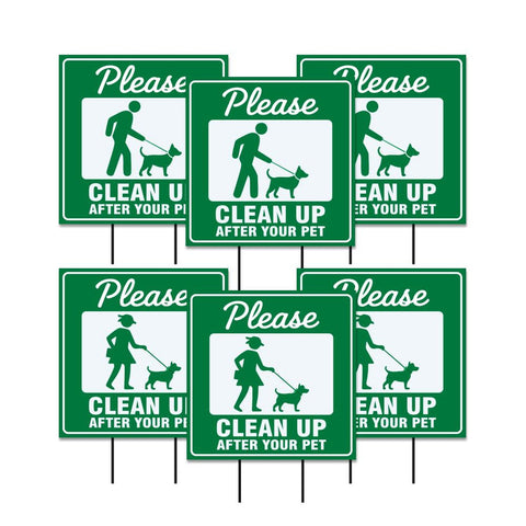 Pack of 6 Please Clean Up After Your Pet Yard Sign - Coroplast Keep Off Grass No Pooping Dog Yard Sign with Stakes. Economical and durable, our Coroplast Yard Signs are a staple of outdoor advertising. These outdoor Keep Dogs Off Yard Sign full color direct printed graphics are vertically fluted for use with Stakes. Coroplast is typically used for yard, parking, real estate, and election signs. They are waterproof.