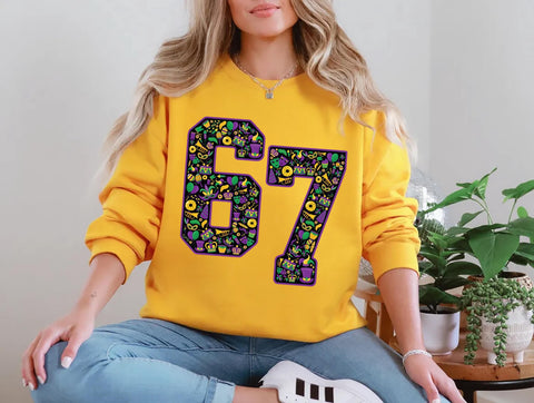 Show off your Mardi Gras spirit with this bold 67 number shirt — filled with masks, crowns, beads, and carnival icons. Perfect for parades and parties.