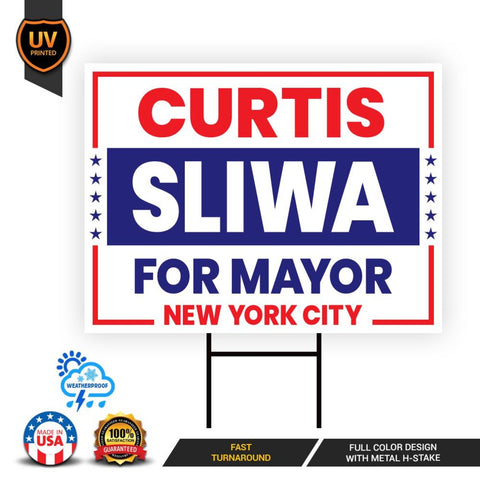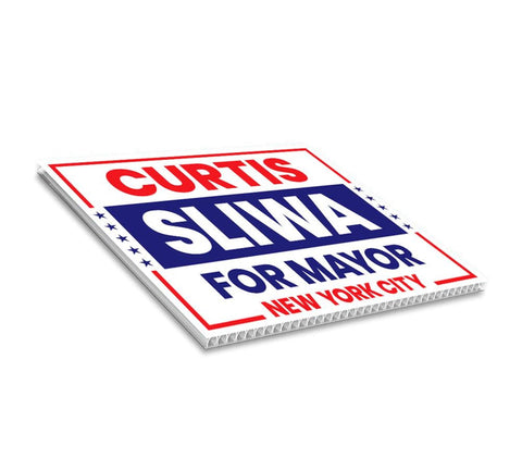 Curtis Sliwa For New York City Mayor 2025 Election Yard Sign, Corrugated Plastic Election Race Red White & Blue Sign with Metal H-Stake. Economical and durable, our Coroplast Yard Signs are a staple of outdoor advertising. These outdoor Curtis Sliwa For New York City Mayor 2025 Yard Sign full color direct printed graphics are vertically fluted for use with an H-Stake. Coroplast is typically used for yard, parking, real estate, and election signs. They are waterproof. Crafted with care, each piece is made to order, ensuring a unique, personalized touch just for you