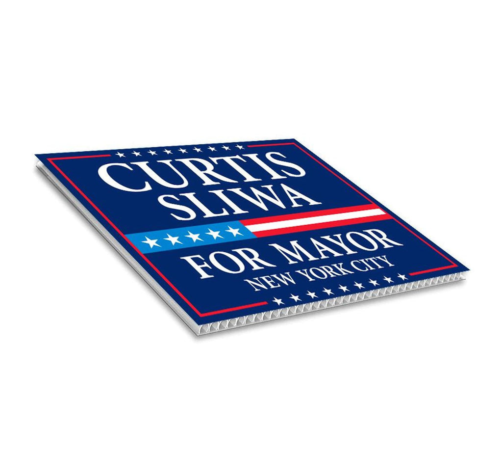 Curtis Sliwa For New York City Mayor 2025 Election Yard Sign, Corrugated Plastic Election Race Red White & Blue Sign with Metal H-Stake. Economical and durable, our Coroplast Yard Signs are a staple of outdoor advertising. These outdoor Curtis Sliwa For New York City Mayor 2025 Yard Sign full color direct printed graphics are vertically fluted for use with an H-Stake. Coroplast is typically used for yard, parking, real estate, and election signs. They are waterproof. Crafted with care, each piece is made to order, ensuring a unique, personalized touch just for you