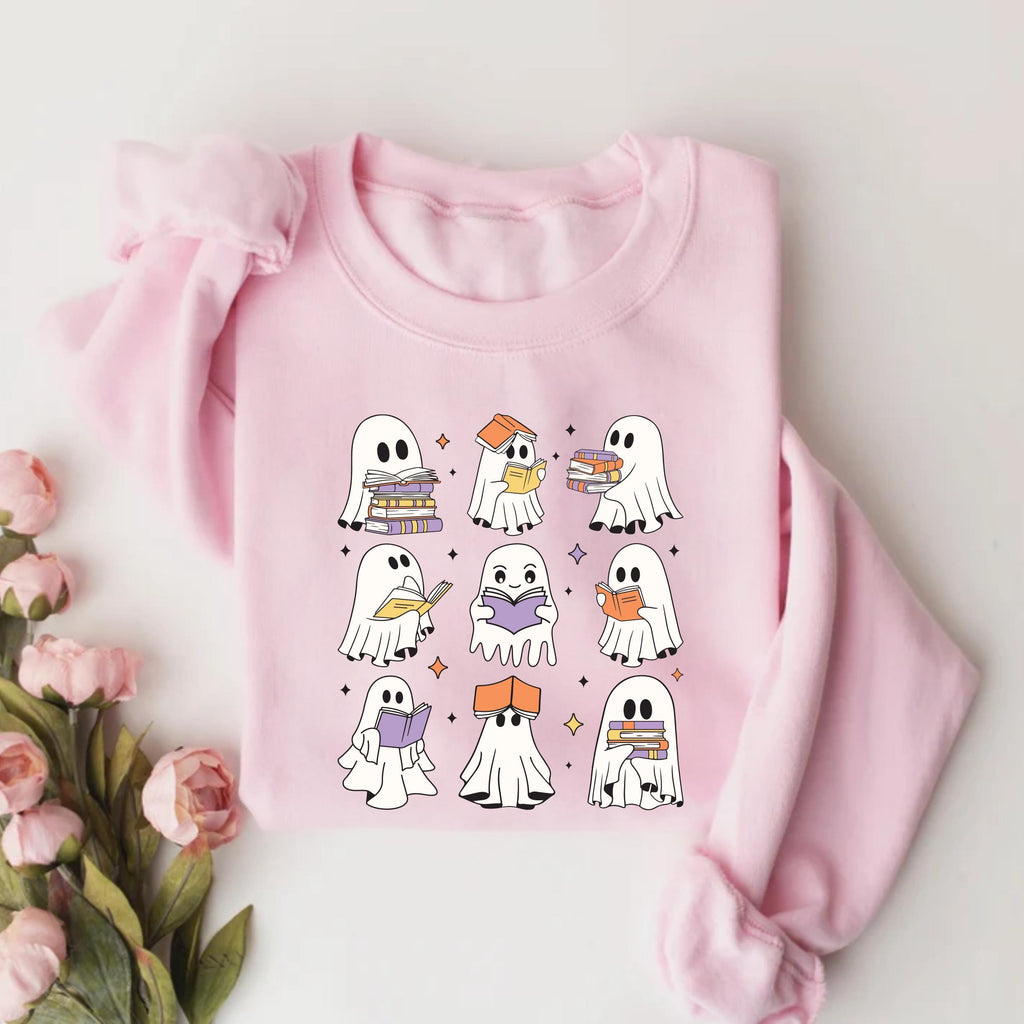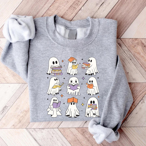 Ghost Reading Books Sweatshirt, Halloween Book Lover Sweater, Spooky Season, Teacher Librarian Halloween Gift, Bookish Halloween Sweatshirt. Split Stitch Double Needle Sewing on All Seams, 1x1 Ribbing at Collar, Cuffs, and Waistband, Tear Away Neck Label.