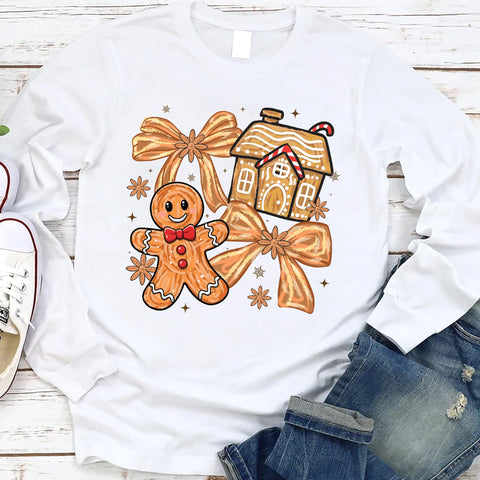 Add a sweet touch to your holiday wardrobe with our Gingerbread Christmas Coquette Shirt! This brushstroke-style Christmas design combines cozy charm with girly festive vibes — perfect for the holiday season.