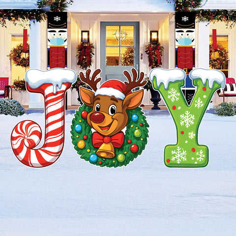 Bring cheerful holiday spirit to your home with this JOY Christmas Yard Sign Set! Featuring a peppermint candy cane “J”, a festive reindeer inside a wreath for the “O”, and a snowflake patterned “Y”, this colorful display adds fun, warmth, and personality to any outdoor space. Perfect for front yards, walkways, gardens, and porch entrances to welcome guests throughout the holiday season.