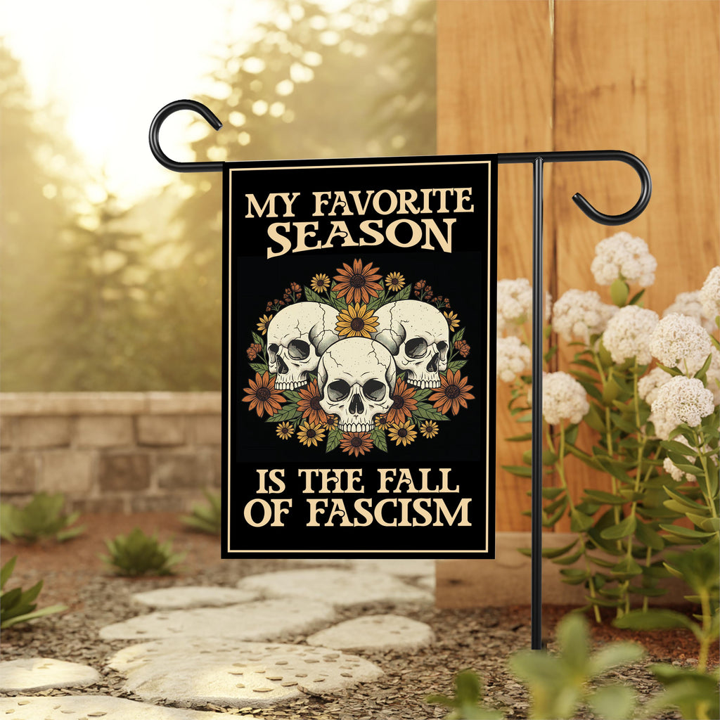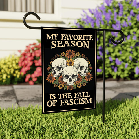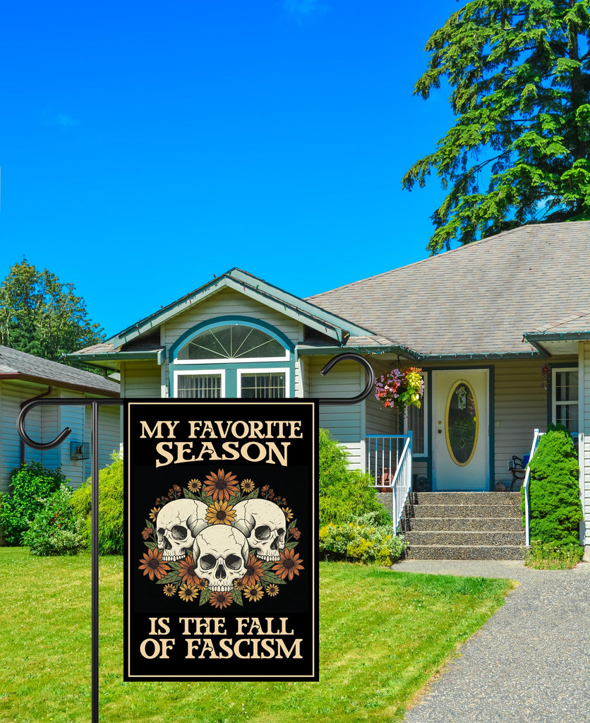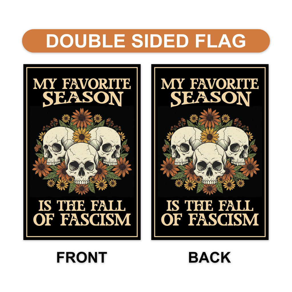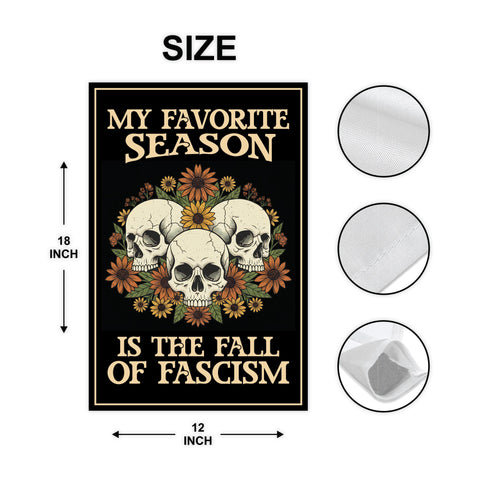 My Favorite Season Is The Fall Of Fascism Garden Flag, Political Protest Flag, Resist Hate Flag, Anti-Trump Skeleton, Resist Fascism Flag100% Polyester.Same Design is Printed On Both Sides,Black Inside Lining.Features Sleeve At Top.Pole, Hooks, Or Fasteners Are Not Included.