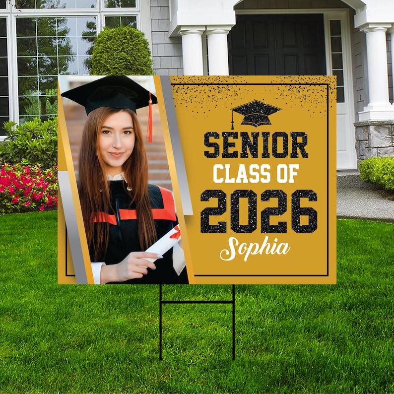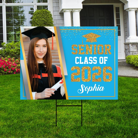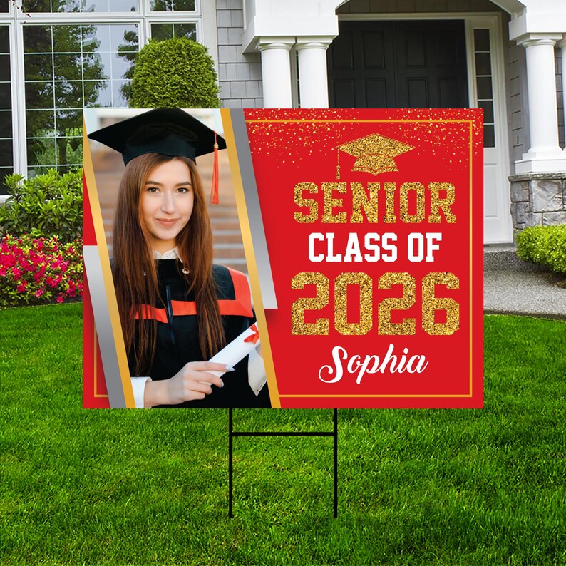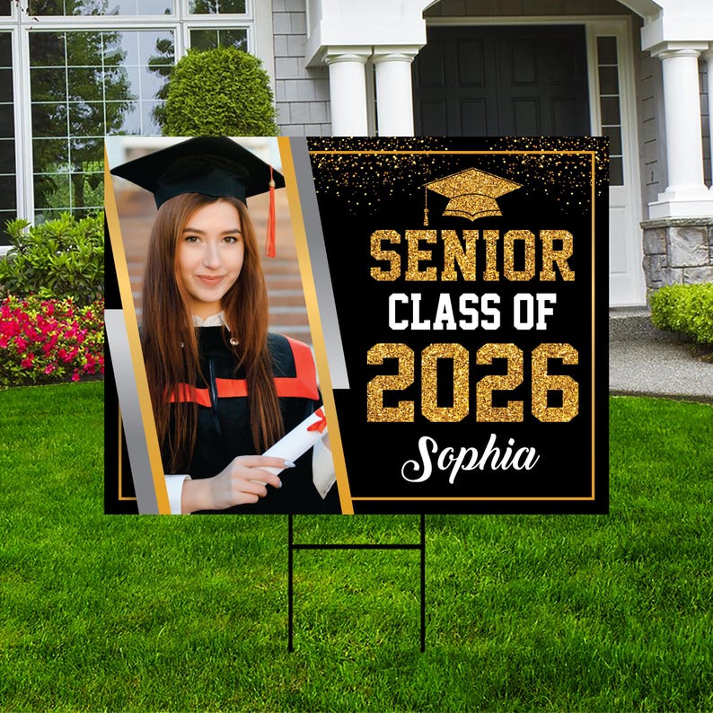 Personalized Graduation Yard Sign 2026 with Photo - Class of 2026, Grad Sign, Custom Graduation 2026 Yard Sign with Metal H-Stake. Economical and durable, our Coroplast Yard Signs are a staple of outdoor advertising. These Custom Class of 2026 Yard Sign for Business full color direct printed graphics are vertically fluted for use with an H-Stake. Coroplast is typically used for yard, parking, real estate, and election signs. They are waterproof.