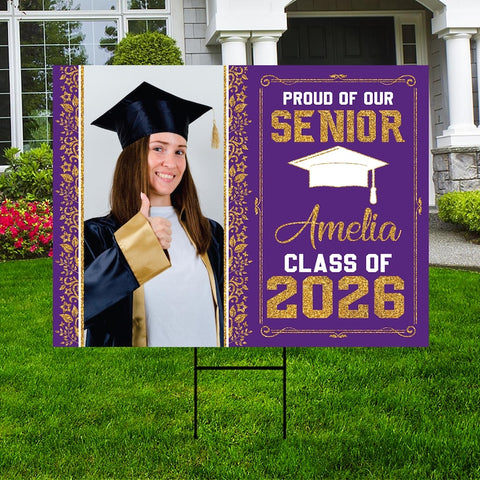 Personalized Graduation Yard Sign 2026 with Photo - Class of 2026, Grad Sign, Custom Graduation 2026 Yard Sign with Metal H-Stake. Economical and durable, our Coroplast Yard Signs are a staple of outdoor advertising. These Custom Class of 2026 Yard Sign for Business full color direct printed graphics are vertically fluted for use with an H-Stake. Coroplast is typically used for yard, parking, real estate, and election signs. They are waterproof.