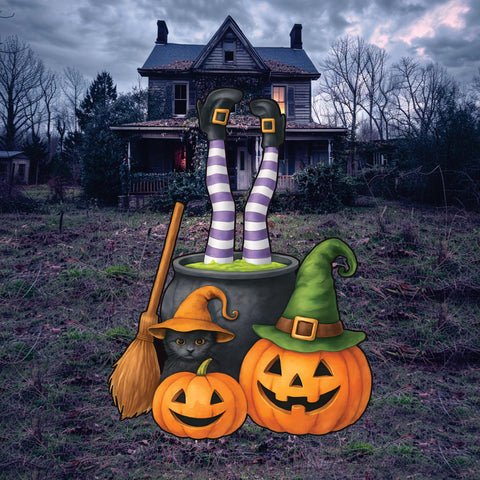 Brew up some Halloween laughs with this Witch Cauldron Yard Sign! Featuring a whimsical witch’s legs sticking out of a bubbling cauldron, surrounded by two pumpkins, a black cat in a hat, and a broom, this outdoor sign adds spooky fun to your porch, lawn, or garden. Made from durable 4mm corrugated plastic and UV-printed for fade-resistant color, it includes rust-free metal stakes for easy setup in any outdoor space.